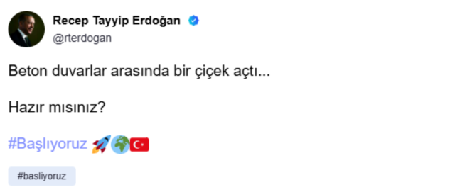Cumhurbaşkanı Erdoğan’ın “Başlıyoruz” etiketli paylaşımında, Türk bayrağı, dünya ve roket emojileri de yer aldı.