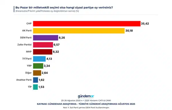 GÜNDEMAR Araştırma, 20-26 Ağustos’ta 60 şehirde 2 bin 225 kişiyle “Türkiye Gündemi” başlıklı bir saha çalışması gerçekleştirdi.