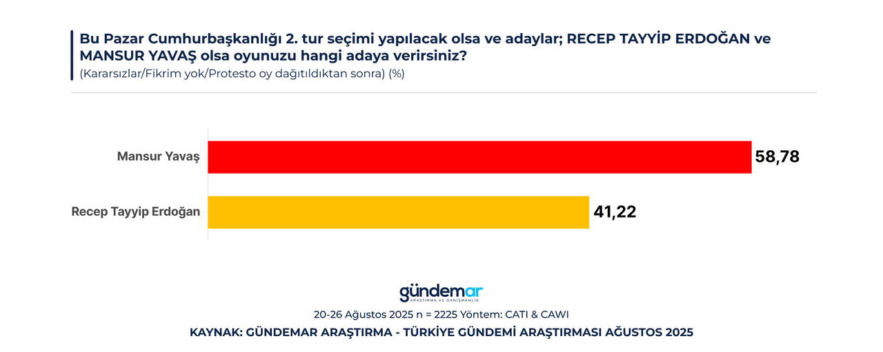 Buna göre, Özel ve Erdoğan’ın aday olduğu durumda, Özel yüzde 51.54, Erdoğan ise yüzde 48.46 oy alıyor.